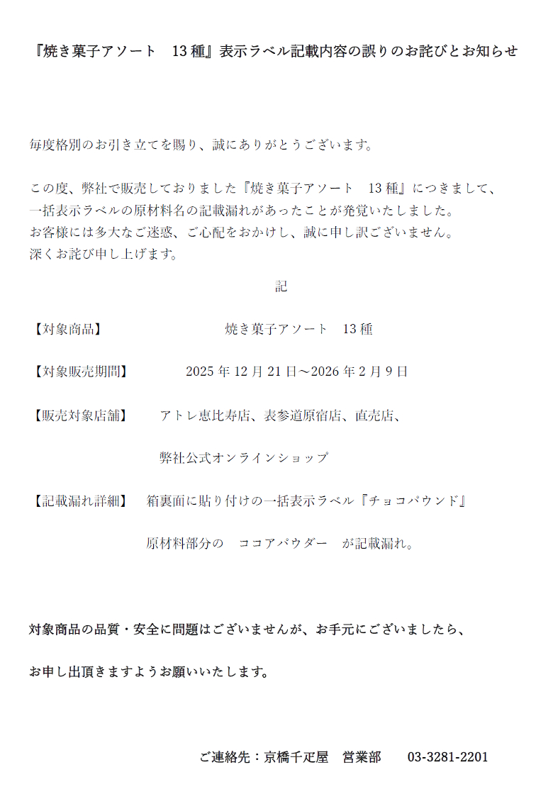 焼き菓子アソート 13種 表示ラベル記載内容の誤りのお詫びとお知らせ