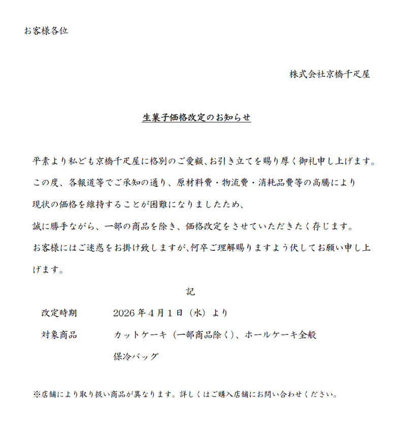 生菓子価格改定のお知らせ