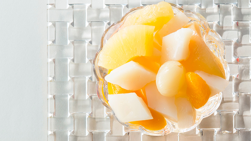 厳選した果実を甘さ控えめのシロップに漬けた杏仁豆腐。