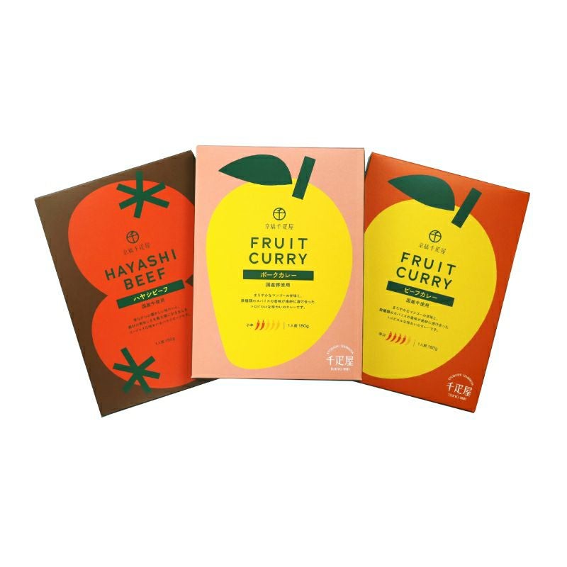 スパイシーでまろやかな2つのフルーツカレーと伝統的な味わいでどこか懐かしいハヤシを1点ずつセットに。