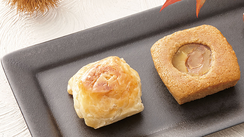 しっとりとしたパイ生地に包まれた渋皮栗と、発酵バターと栗ペーストでしっとり焼き上げた焼き菓子のセット。