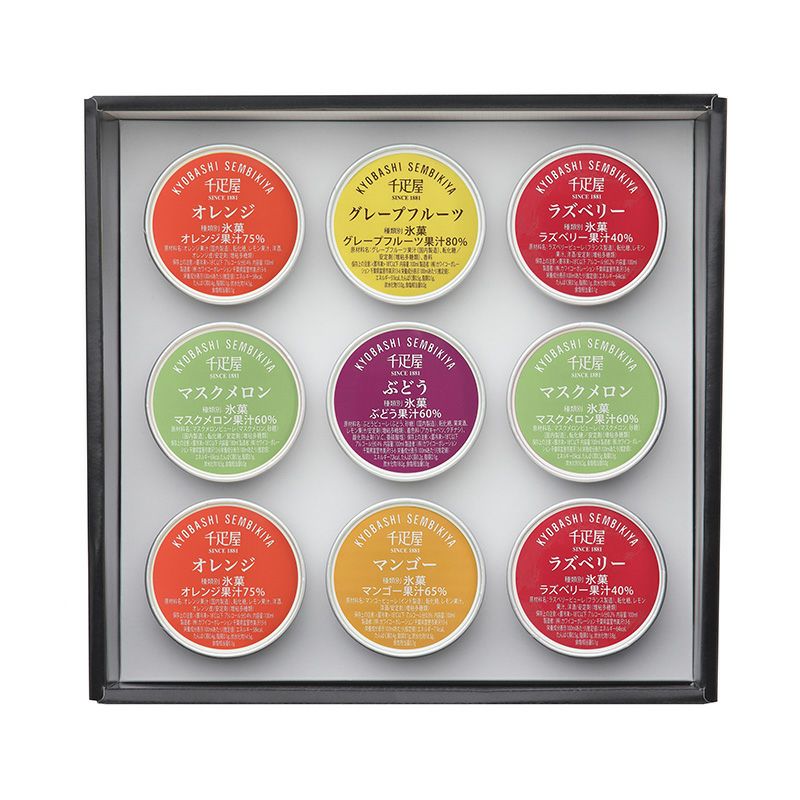 内容 | マスクメロン・オレンジ・ラズベリー各2個、マンゴー・ぶどう・グレープフルーツ 各1個 9個入 各100ml |