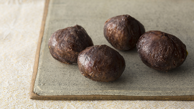 渋皮つきのまま柔らかく煮上げ、最後にシロップを浸け乾燥させました。栗本来の味を味わっていただけるよう、洋酒は使用していません。