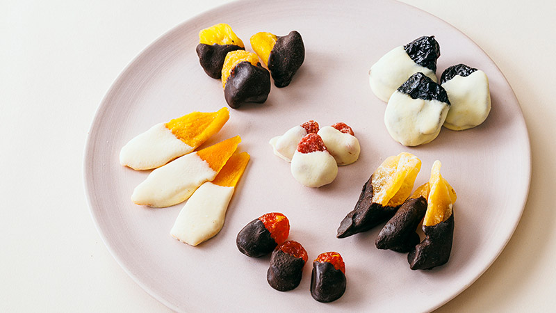 果物の存在感を生かしながら、職人が一つ一つ手作業でチョコレートをコーティング。