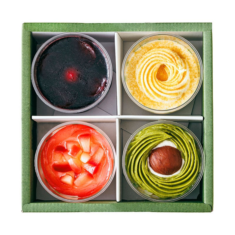 | 内容 | フルーツゼリー 内容量 約152g フルーツババロア 内容量 約132g りんごのレアチーズ 内容量 約112g 抹茶モンブラン 内容量 約107g バナナティラミス 内容量 約88g ぶどうゼリー&2層のムース 内容量 約159g 各1個 計6個入 ※手作りの商品のため、内容量は若干前後することがございます。 |