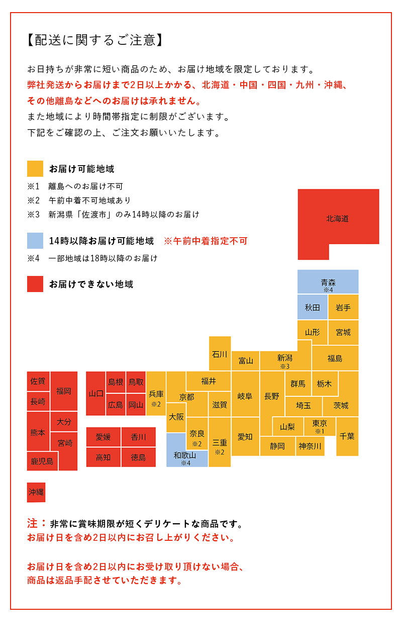 | 賞味期限 | 製造日より3日(お届け日含め2日) |